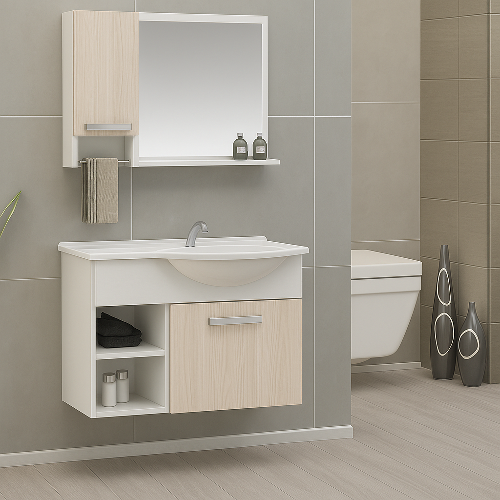 Kit gabinete,cuba e espelheira 0,60MT Branco/Madeirado 0974