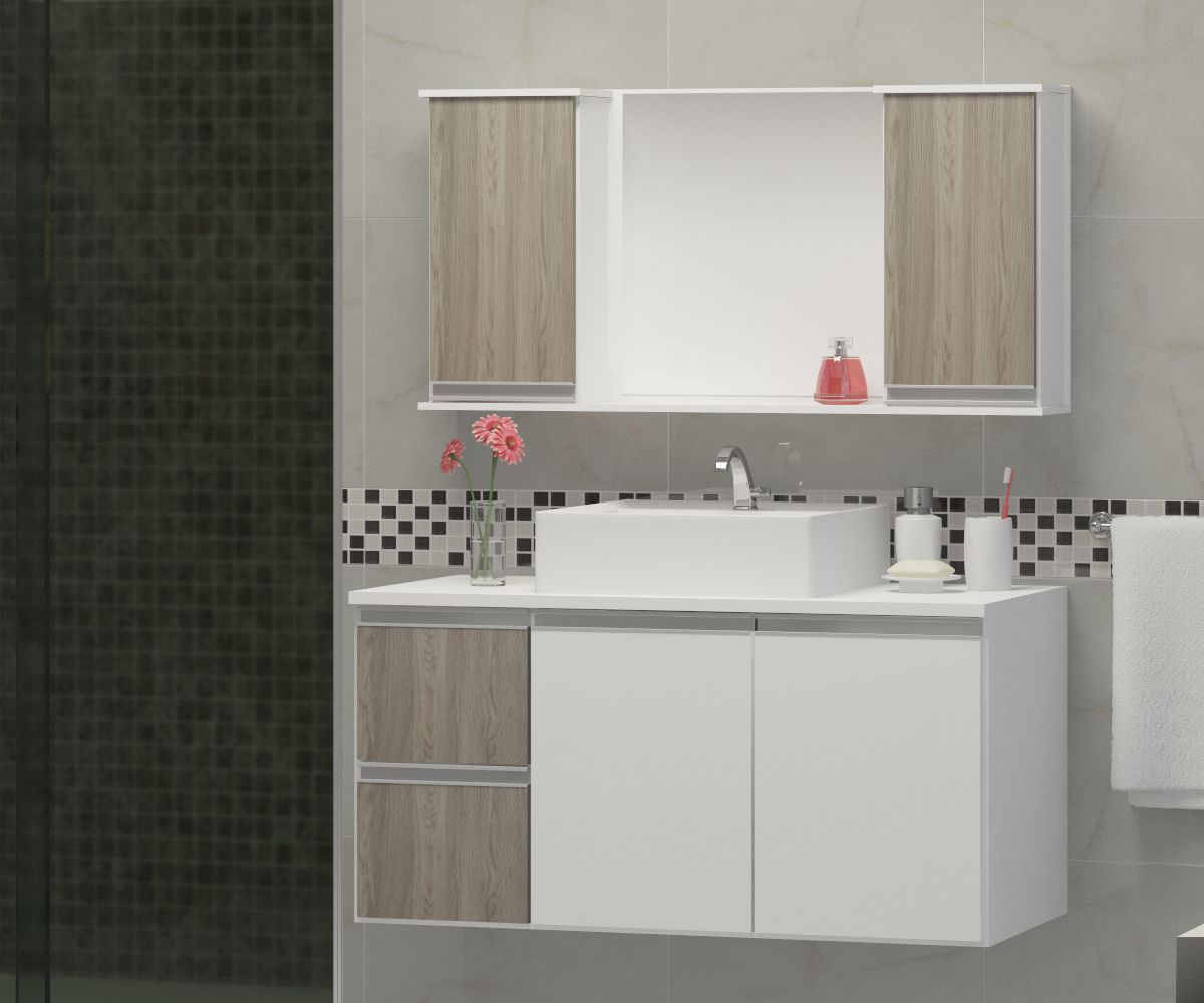 Itens na caixa – 01 Gabinete - 01 Cuba – 01 Espelheira – Buchas e parafusos para fixação